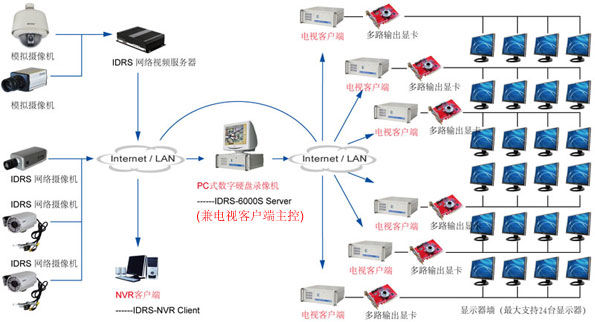 3)以IDRS-NVMS網(wǎng)絡(luò)視頻集中管理系統(tǒng)作為主控設(shè)備的網(wǎng)絡(luò)電視墻典型應(yīng)用原理圖: