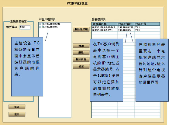 第二步:進(jìn)入主控設(shè)備軟件中的PC解碼器設(shè)置界面,對(duì)電視客戶端進(jìn)行配置。