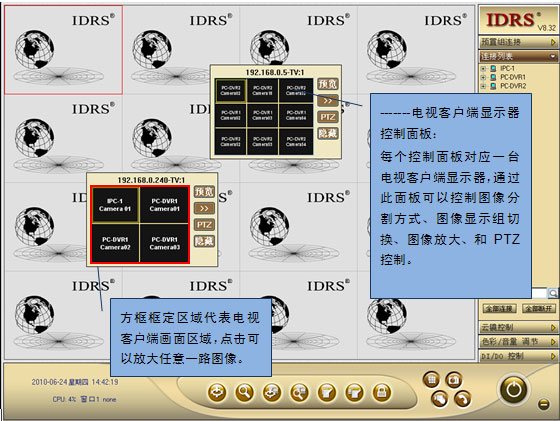 IDRS-PC Server、NVR客戶端或IDRS-NVMS集中監(jiān)控管理系統(tǒng)中的中心管理服務(wù)器、流媒體服務(wù)器和集中管理客戶端都可以作為主控設(shè)備來(lái)控制電視客戶端,一臺(tái)主控設(shè)備可以同時(shí)控制多臺(tái)電視客戶端,但所有電視客戶端的顯示器總數(shù)不能超過(guò)24臺(tái)(即一臺(tái)主控設(shè)備最多能控制由24臺(tái)顯示器組建的顯示器墻)。